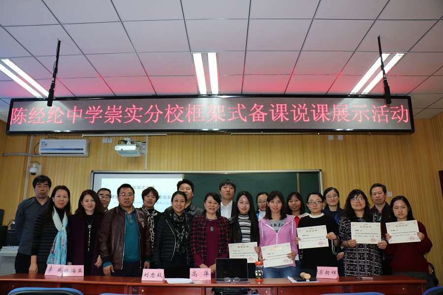2017年3月4日,陈经纶中学崇实分校开展“推进框架式备课,深化课堂教学改革,促进教师专业发展”主题框架式备课说课展示活动。朝阳区教研中心小学教研室主任高萍、教研员苏朝晖、马妍等专家出席活动,陈经纶中学科体艺美工作主管校助刘忠毅、本部初中语文特级教师冯淑娟、帝景分校教学主任李威、英语教研组长侯海英及崇实分校全体干部教师与会。