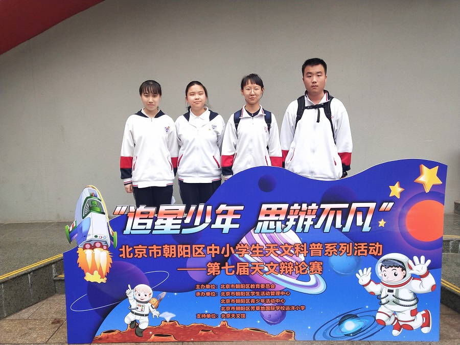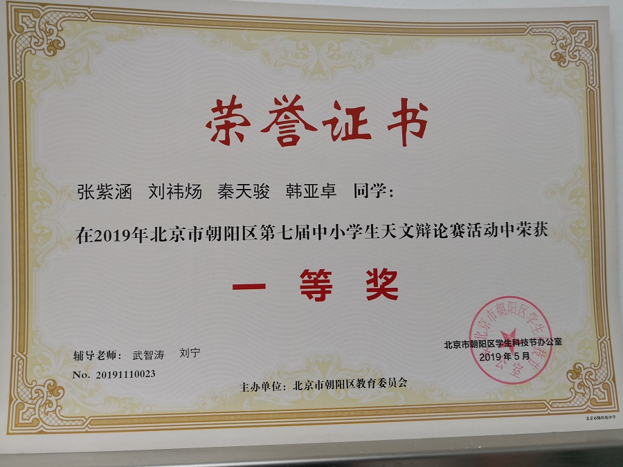 在刚刚落幕的2019年朝阳区第七届中小学生天文辩论赛中,陈经纶中学本部高中校区天文地学社团四位成员力挫群雄,一举夺得比赛一等奖。同时,韩亚卓同学荣获“最佳辩手”称号,社团指导教师武智涛、刘宁(天文专家)荣获辅导一等奖。