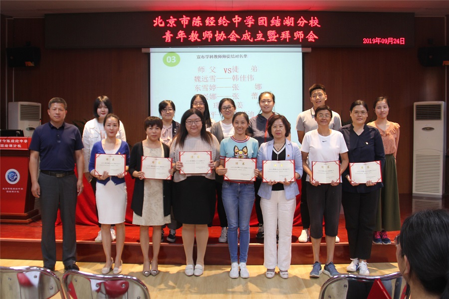 2019年9月24日,陈经纶中学团结湖分校隆重召开初中部青年教师协会成立暨拜师启动会。会议由团结湖分校科研副主任贾春丽主持,初中部全体教师与会。