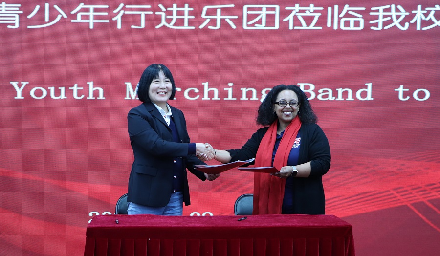 随后,在报告厅举行了简短的欢迎和签约仪式,陈经纶中学党委副书记冯梅致欢迎词,冯梅副书记和美国托马斯·伍顿高中校长助理共同签署“中美青少年音乐主题交流友好合作备忘录”。