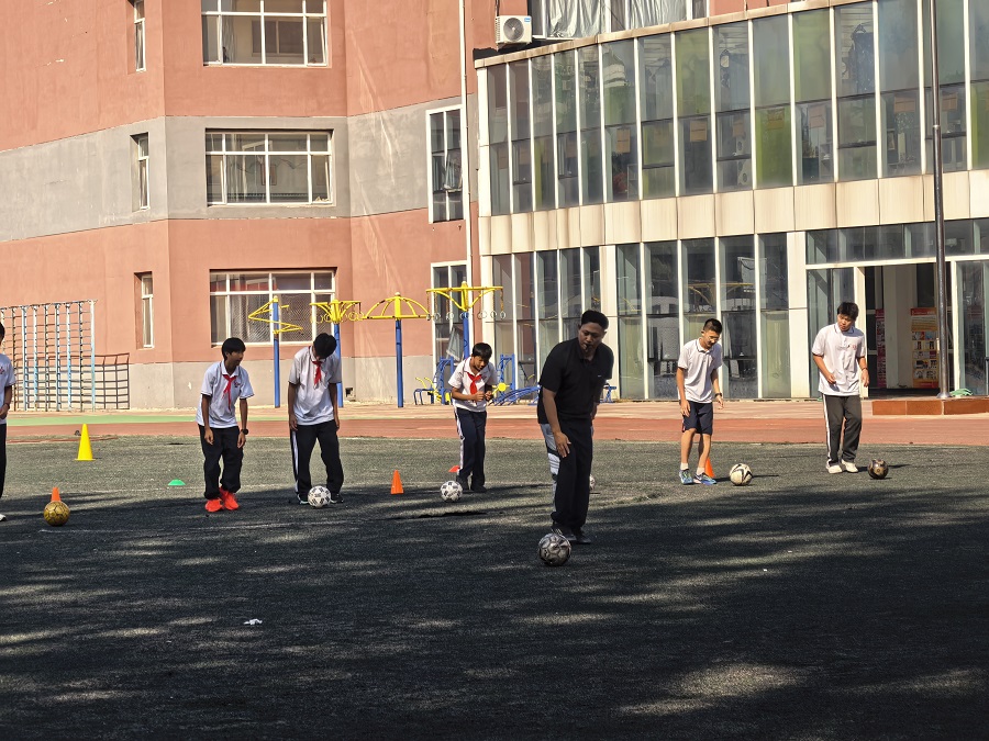 民族分校于海健老师讲授“足球脚背正面直线运球+木球竞速”展示课。本节课通过原地触球、上一步拨球等练习活动,发展学生下肢运动能力,培养学生胜不骄、败不馁的体育品德。将“木球竞速”这一民族传统体育项目作为辅助游戏引入课堂,有效增强学生民族认同感。