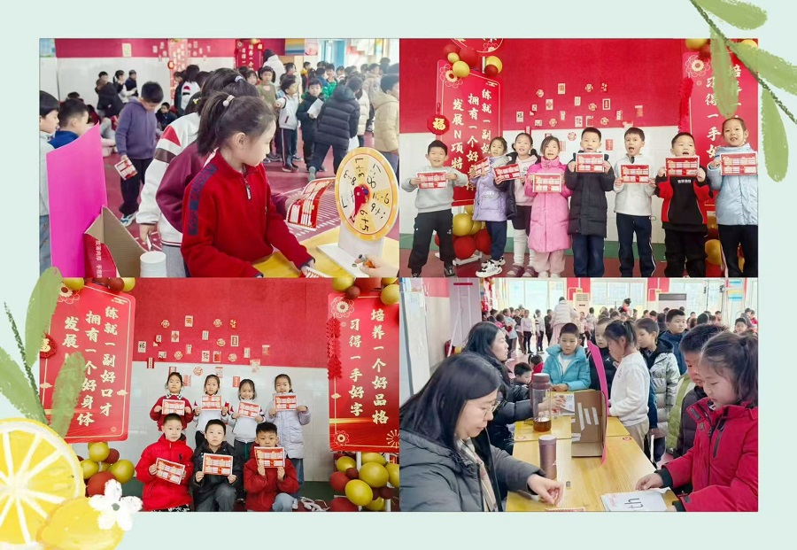 天街新元校区的期末闯关同样精彩纷呈。一年级以“快乐玩中学·知识大闯关”为主题,拼音快跑、汉字探秘、诗文牧场、口算比拼等关卡标识醒目,孩子们手持积分卡,在老师的耐心引导下沉着作答;二年级乐考深度融合语文背诵朗读、数学分类辨向、英语演唱手抄报等,闯关盖章的评价机制让考评氛围轻松愉悦。