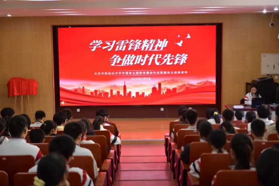 为更好地传承和弘扬雷锋精神,践行经纶“学而事人”的光荣传统,3月5日,2026年学雷锋纪念日之际,北京市陈经纶中学本部高中校区举行学雷锋主题教育暨校园志愿服务公益岗揭牌仪式。本部高中党总支书记程木昌、德育主任吴爱兄和骨干学生干部代表一同参加。活动由校团委副书记杨鸿菲主持。