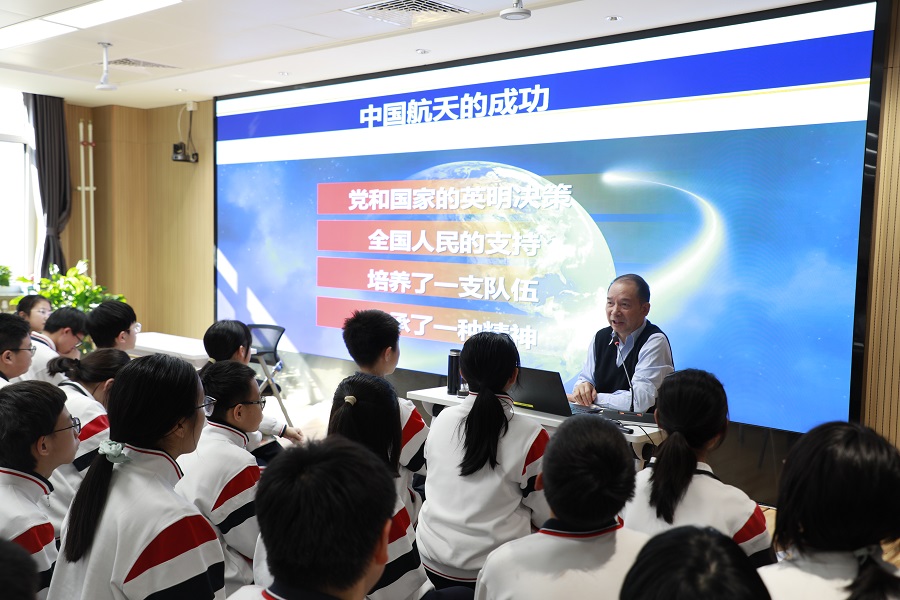 初二(2)班齐泽民:我向申老师提出了一个问题:中国人用37年完成第一次一百次火箭发射,靠的是什么?申老师认真听完,坚定地告诉我:是人才。这两个字虽然简单,却让我豁然开朗。中国航天能一步步走向成功,正是因为有一代又一代优秀人才前赴后继、刻苦钻研。没有强大的人才队伍,就没有今天的航天奇迹。这也让我深深明白,国家的发展、科技的进步,最终都要靠人才来支撑。